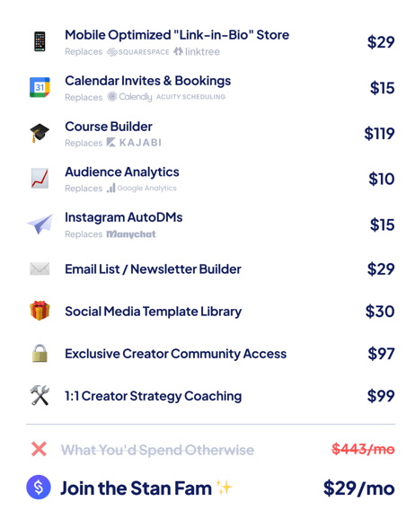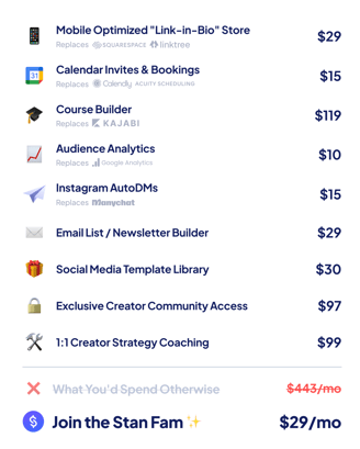 Here’s the part people don’t always talk about. When you add up what you’d normally spend on a membership platform, a chatbot service like ManyChat, an email marketing tool, a link-in-bio builder, and a funnel builder, it gets expensive fast.